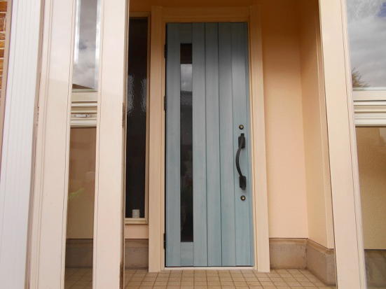 改修中の現場でしたが、 工事の合間を見て施工させて頂きました! 玄関と勝手口の同時作業で、 外壁のブルーも冴えています。 |
