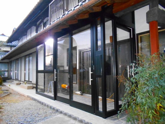 ハンドメイドの風除室で驚きましたが、 やっぱり見た目がちょっと・・・。 東信日軽設計・施工、アルミ製風除室で ビシッとカッコ良くなりました! |