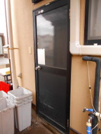 うまいラーメン屋の勝手口、 厨房には必須アイテムの網戸付きドアです。 吊元も変更し、握り玉もレバーになったので 使い勝手も良くなるでしょう。 |